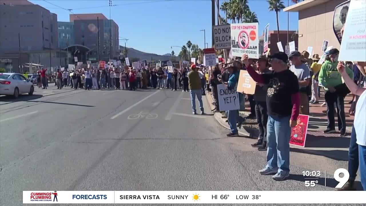 The crowd gathered around the Tucson Federal Building, with organizer Aurora Ramirez leading the march through city streets. The protest comes as businesses across the city closed their doors and school districts in Tucson cancelled classes in anticipation of the protests.