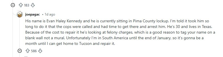 Pagac also left this comment, below, on reddit, making mention of the severity of mural vandalization: