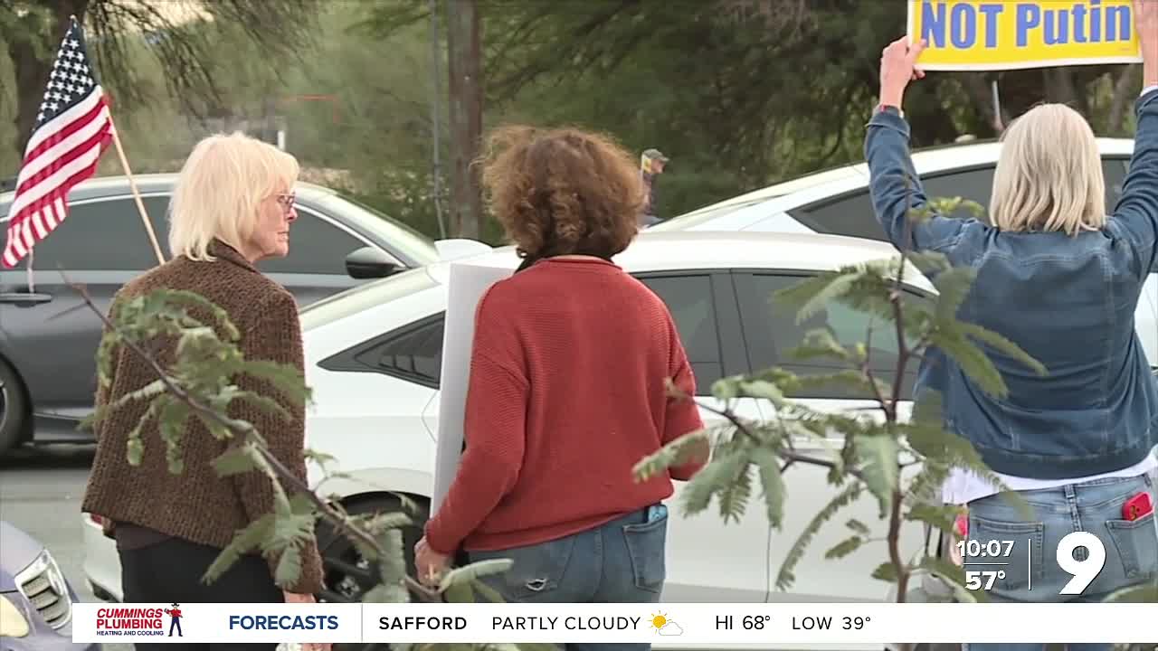 Protesters gathered outside Davis-Monthan Air Force Base to voice opposition to the Trump administration's military intervention in Venezuela, including the bombing of the country and arrest of President Nicolas Maduro.