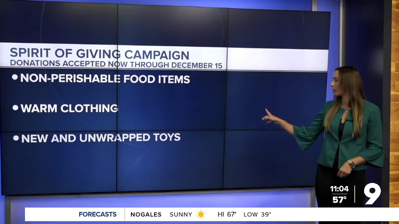 The Spirit of Giving campaign runs through Dec. 15. Donations such as warm clothing, new and unwrapped toys, and non-perishable food items are accepted.