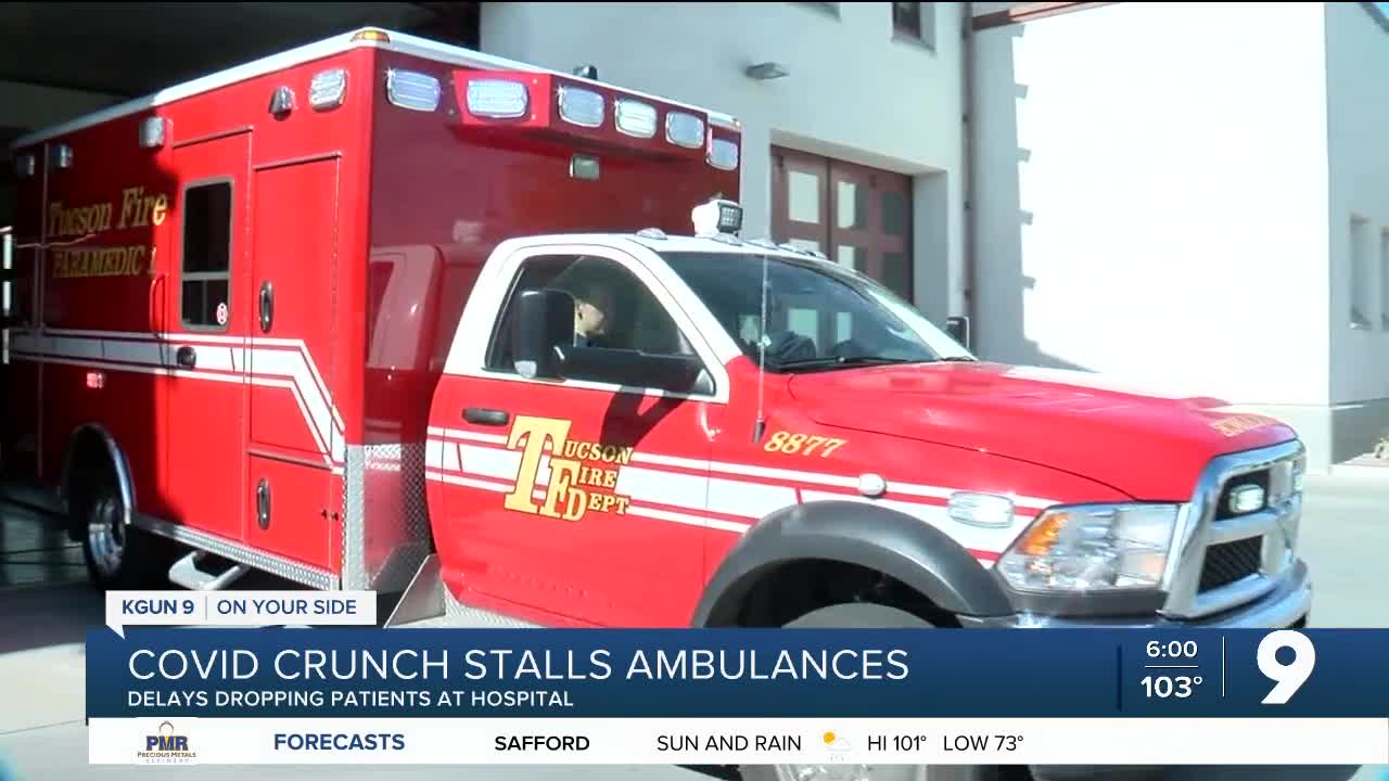 TUCSON, Ariz. (KGUN) — The COVID crunch at the hospitals is leaving some ambulances waiting to drop off their patients. It can delay getting ambulances back on the road for their next call.