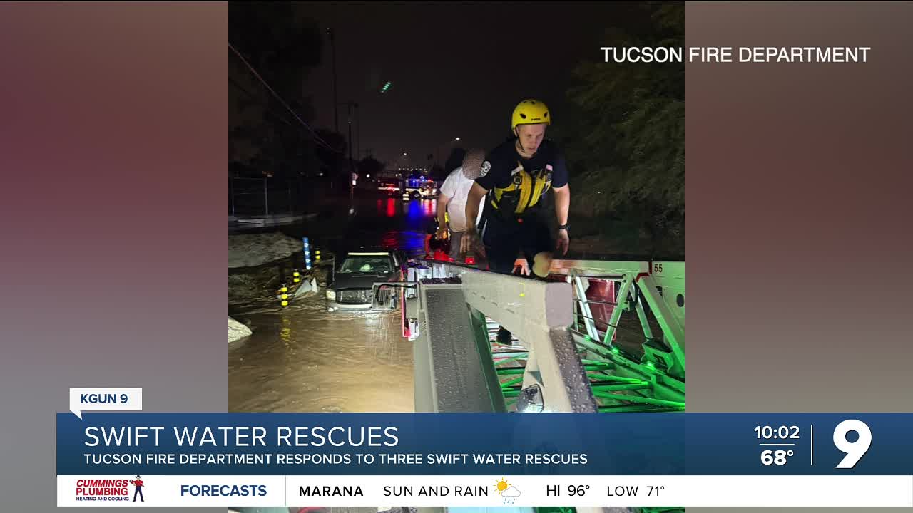 TUCSON, Ariz. (KGUN) — The first rescue took place around 4 p.m. Sunday near the Alamo Wash behind Tucson Medical Center, at Grant and Craycroft. According to Tucson Fire officials, the water was about four feet deep when a man and his son spotted someone in the wash and followed them for approximately 100 yards.