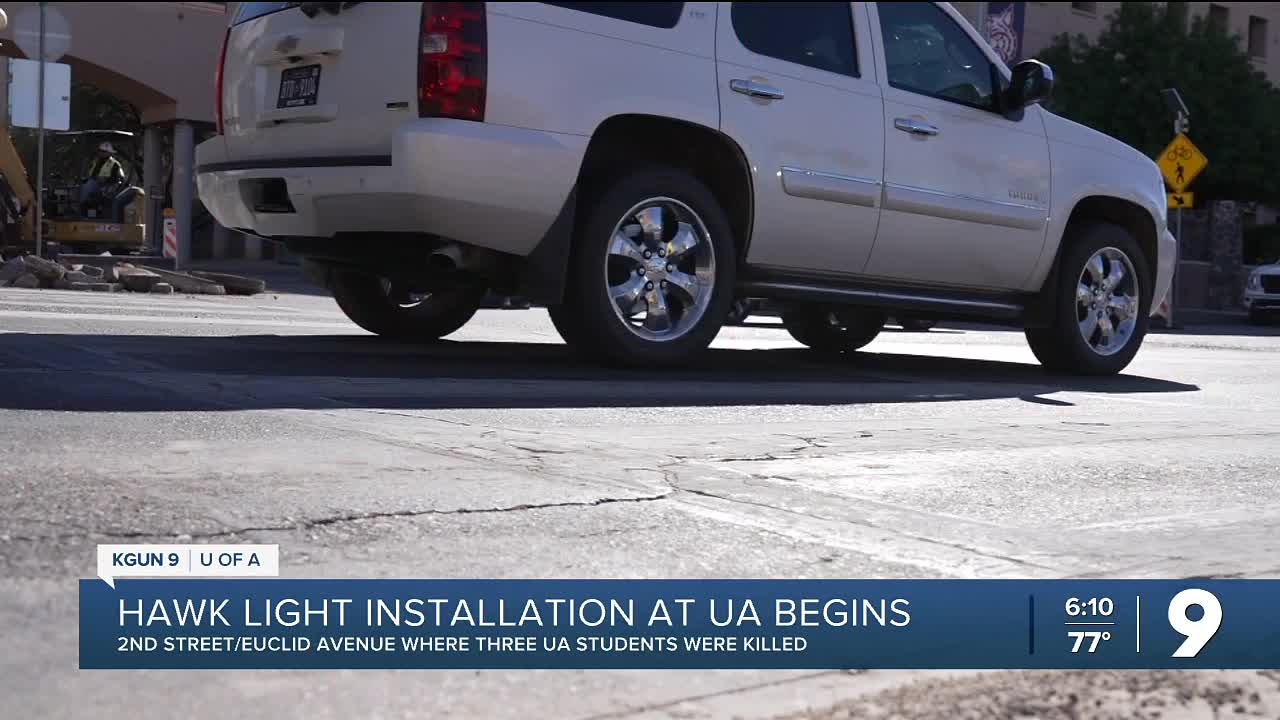 TUCSON, Ariz. (KGUN) — Construction is underway on Euclid Avenue and 2nd Street, near the University of Arizona to install a pedestrian-hybrid beacon, also known as a HAWK light, at one of the busiest crosswalks on campus.