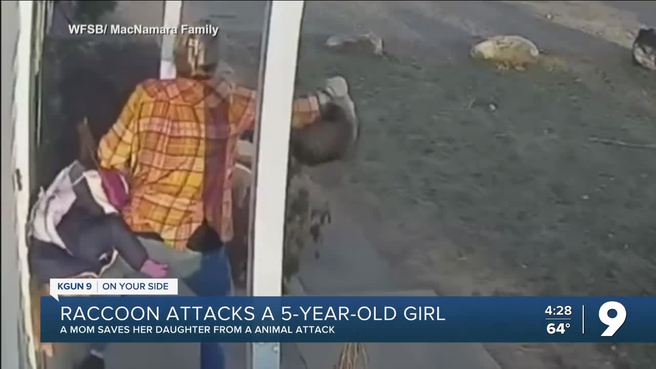 A mother in Connecticut rushed to save her daughter after she was attacked by a raccoon at the front door of their home.