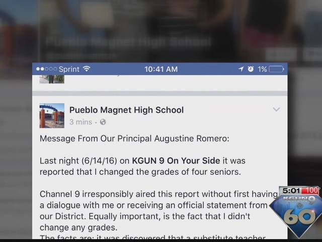 The principal posted on Pueblo High School's Facebook page after our story aired. He wrote: "Last night on KGUN9 On Your Side, it was reported that I changed the grades of four seniors. Channel 9 irresponsibly aired this report without first having a dialogue with me or receiving an official statement from our District. Equally important, is the fact that I didn't change any grades."