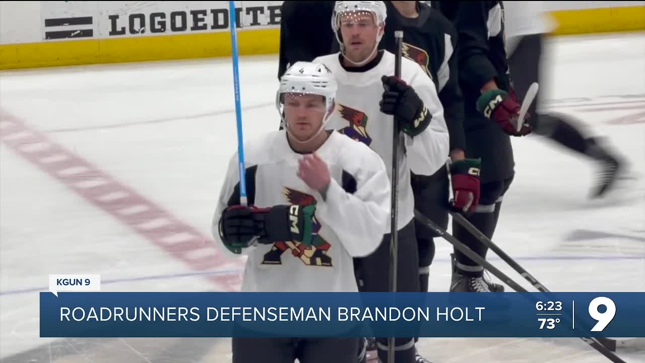 TUCSON, Arizona — On the practice ice at the Tucson Arena, one piece of equipment immediately catches the eye: a well-worn blue hockey stick in the hands of new Roadrunners defenseman Brandon Holt.