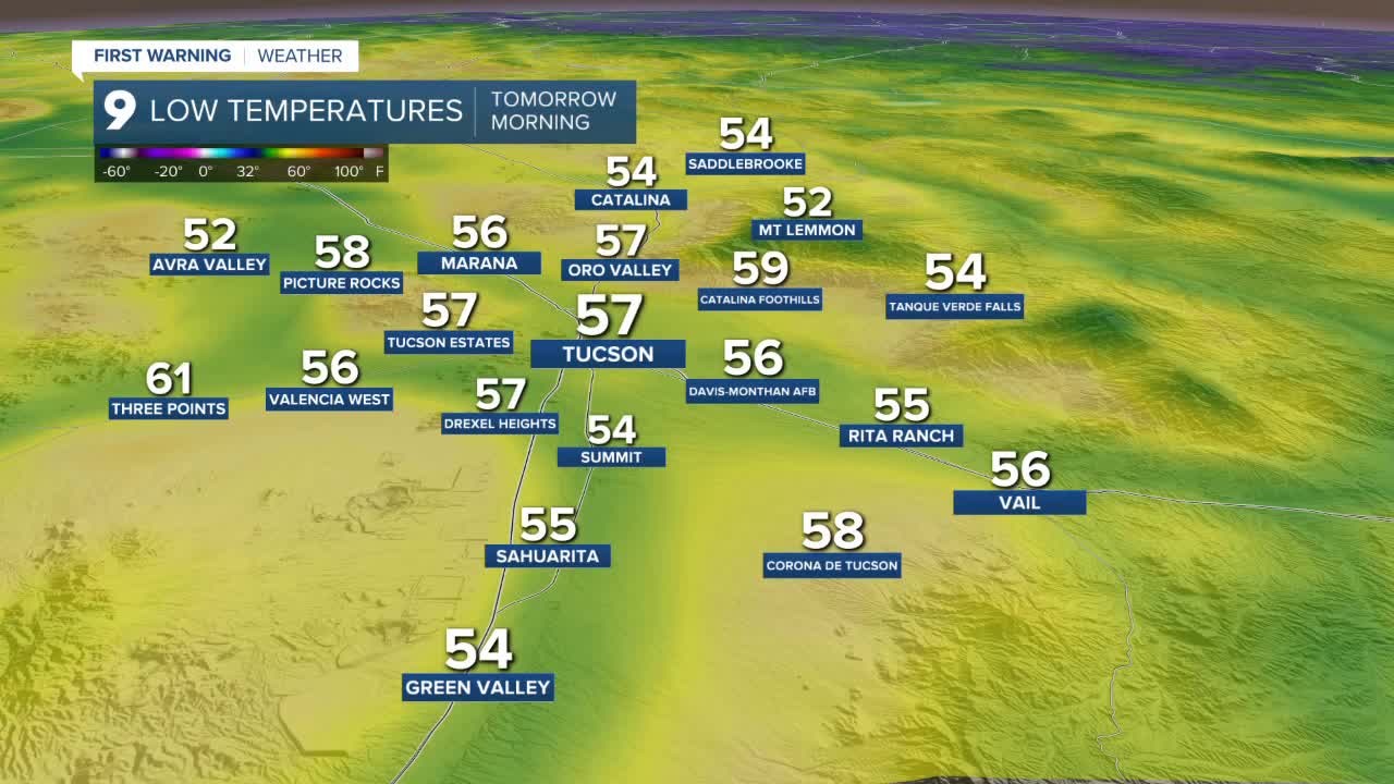 Overnight lows early Monday morning will fall into the 50s and 60s for most communities. Tucson is expected to drop to around 57 degrees, while Sierra Vista will be slightly cooler at about 53 degrees. Some areas, including Willcox and Benson, will see lows in the 40s.