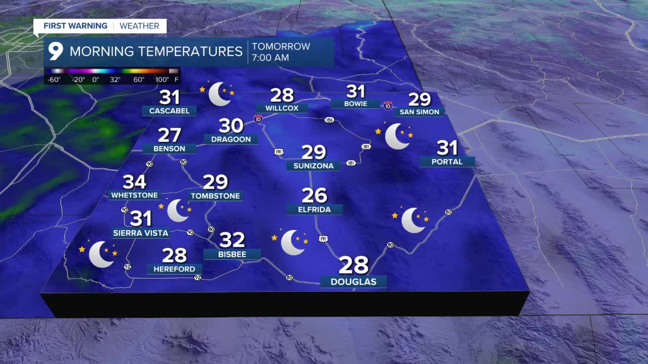 Many areas could once again wake up to freezing temperatures Tuesday morning. Sierra Vista is forecast to drop to 31 degrees, while colder spots such as Willcox and Elfrida could fall into the mid to upper 20s.