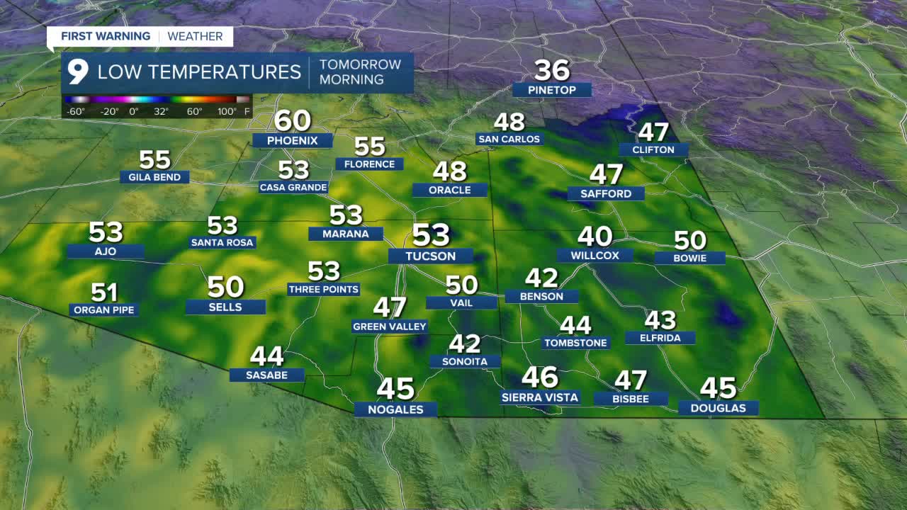 Friday morning will start cool across the region. Tucson is expected to wake up around 53 degrees, with most of southern Arizona seeing lows in the 40s and 50s.