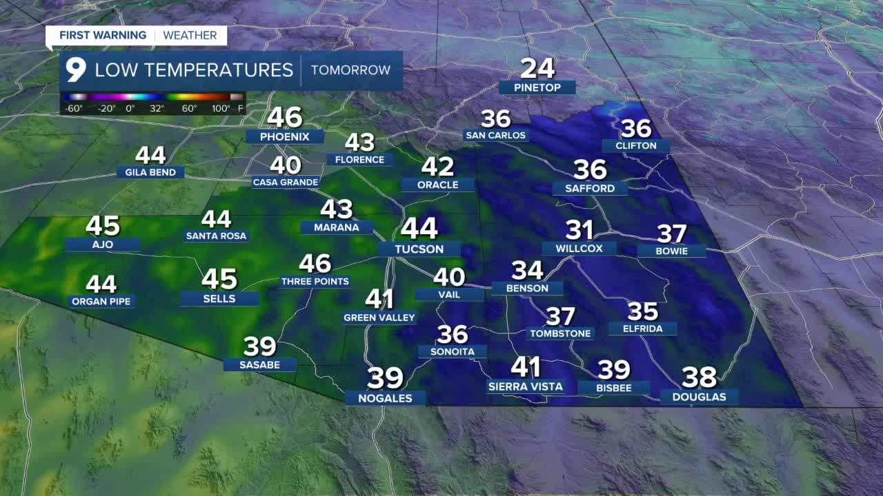 Overnight lows on Tuesday will dip into the 40s across Pima County. Tucson is expected to fall to around 44 degrees. Sierra Vista will be a bit cooler with a low near 41 degrees, while parts of Cochise County will see freezing temperatures. Wilcox could drop to 31 degrees by sunrise.
