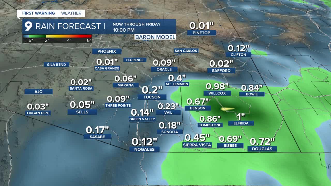 Thursday will bring 0.10” to 0.25” of rain to areas from Tucson to the west along with up to an inch of rain across portions of Cochise County.