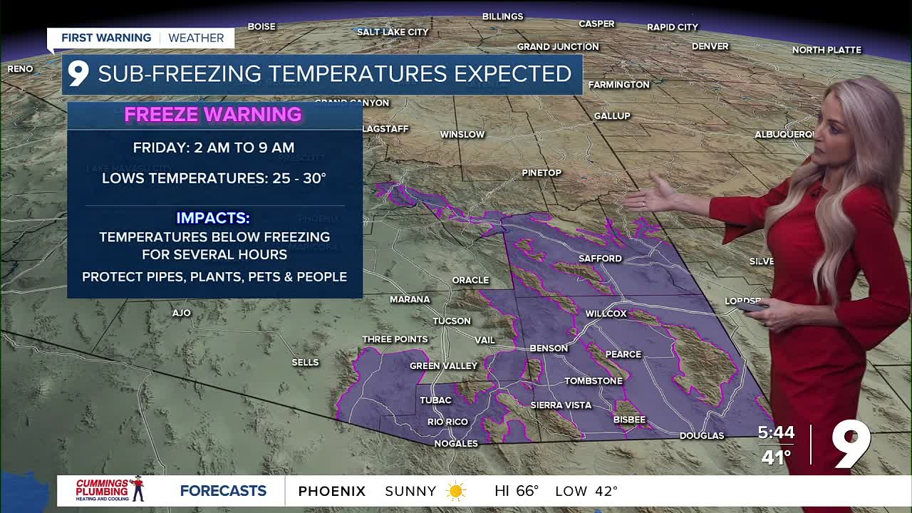 Cold morning lows are expected the next few mornings, with widespread sub-freezing temperatures likely in the valleys east and south of Tucson. A Freeze Warning is in effect for those areas from 2 to 9 AM Friday morning.