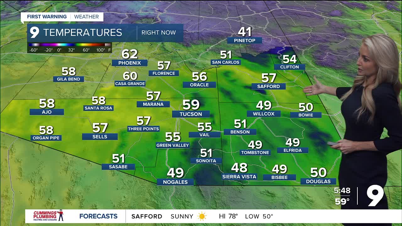TUCSON, Ariz. (KGUN) — Morning temps will be in the 50s and 40s across southeast Arizona, then warming to the 70s for most areas.