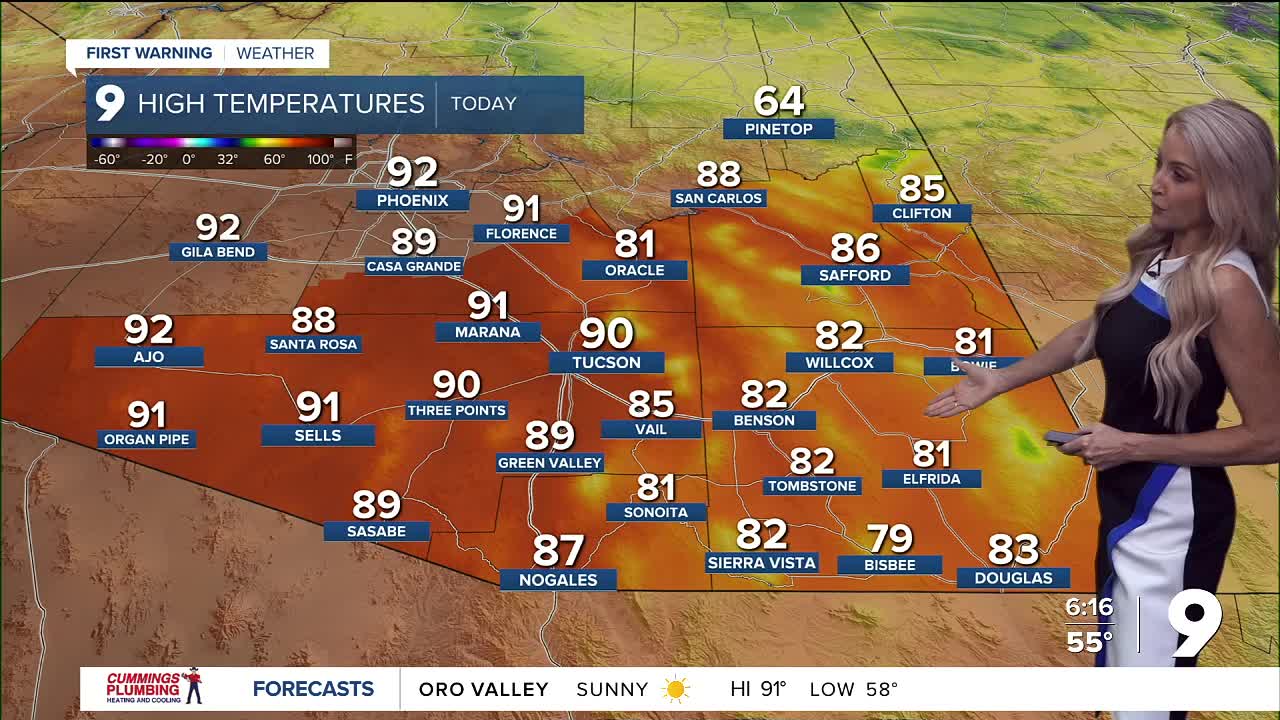 TUCSON, Ariz. (KGUN) — Sunny and warmer again today. Tucson will be around 90°.