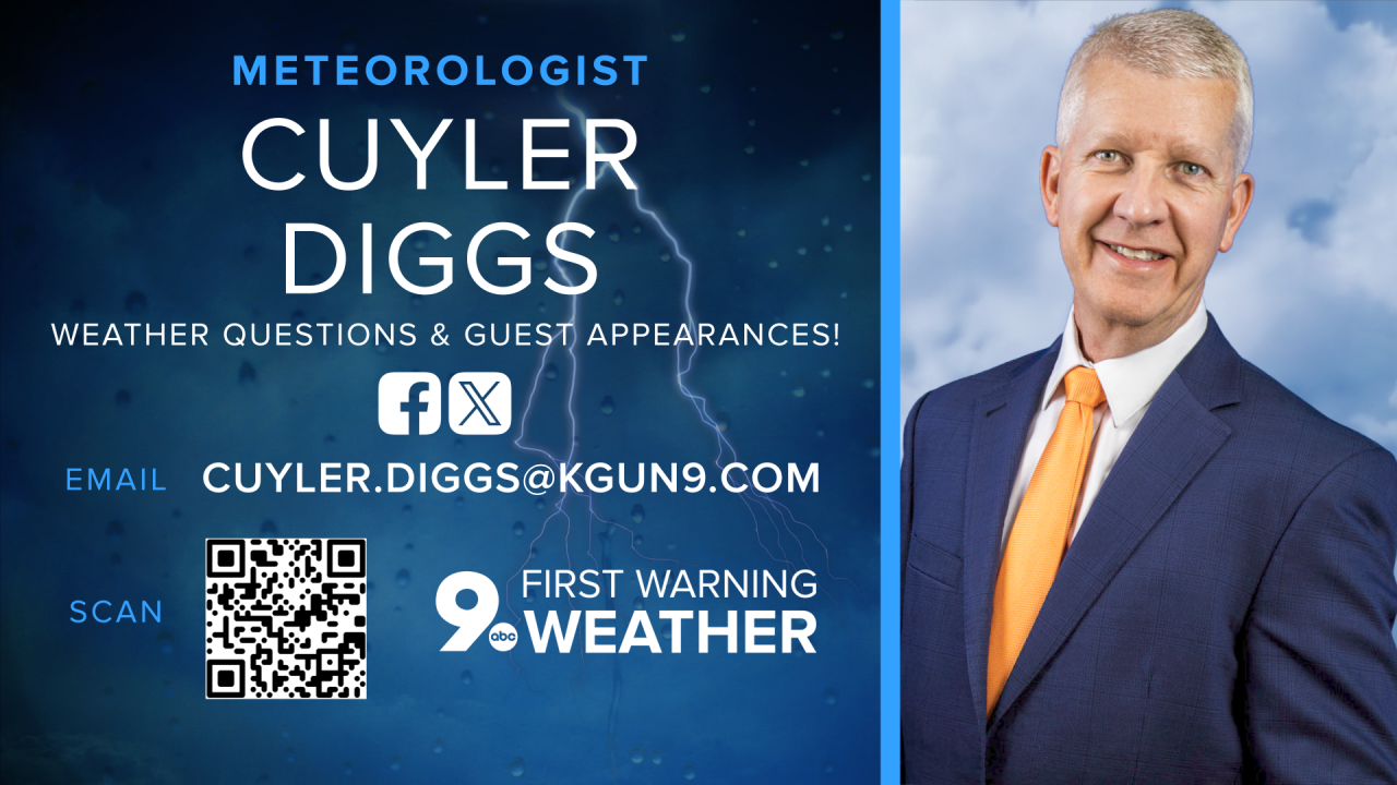 Cuyler Diggs is a KGUN 9 Meteorologist. Cuyler has been forecasting the weather in southern Arizona since 2003. He has experience forecasting and covering all kinds of weather since becoming a weather anchor in 1996. Share your story ideas and important issues with Cuyler by emailing cuyler.diggs@kgun9.com or by connecting on Facebook and X.
