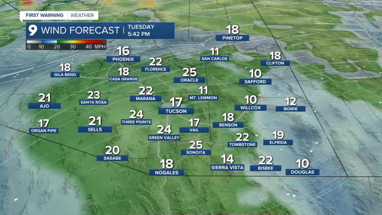 Tuesday and Wednesday will bring southwest wind across southern Arizona with wind speeds of 15 to 25 and even strong wind to the southeast of Tucson.