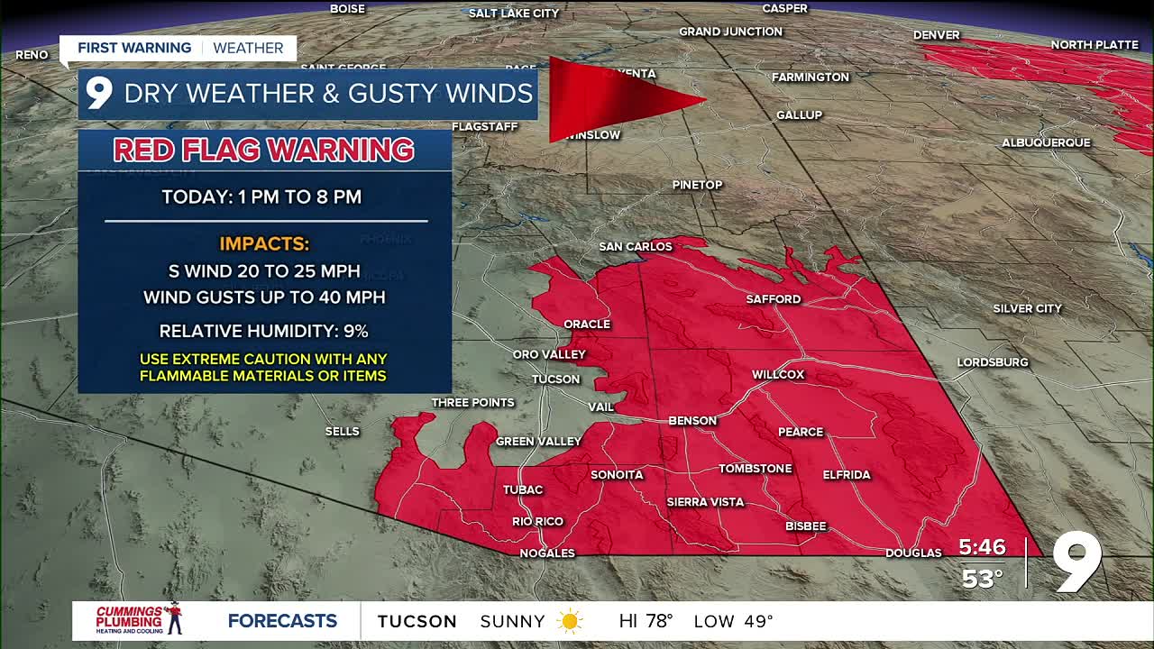 TUCSON, Ariz. (KGUN) — Gusty winds are moving across southeast Arizona today as a dry weather system pushes through the region. Southwest to west winds will be breezy at times, with some stronger gusts possible this afternoon and early evening. Because of the dry conditions and wind, a Red Flag Warning is in effect from 1 to 8 p.m. for parts of the area, including Santa Cruz County, Cochise County, and far southeastern Pima County. That means fire danger will be elevated to critical, so it’s a good day to avoid activities that could spark a fire.