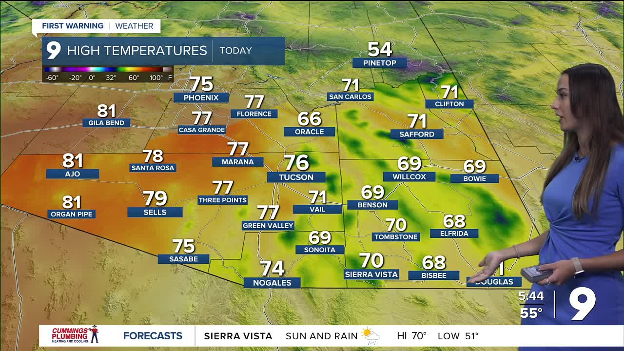 TUCSON, Ariz. (KGUN) — Southeast Arizona will see a few passing effects from a large Pacific storm system over the next several days, but impacts will stay fairly limited. A few light showers are possible Wednesday morning, mainly from Tucson westward, though many may not reach the ground. Wednesday afternoon brings just a spotty shower or two, with most areas staying dry under mostly cloudy skies and temperatures still about 10 degrees above normal.