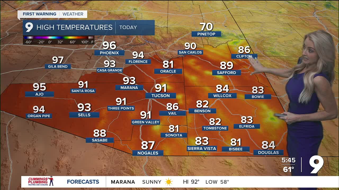 TUCSON, Ariz. (KGUN) — Sunny skies and warmer highs, once again. Afternoon temperatures will stay 6-10° above normal through Friday.
