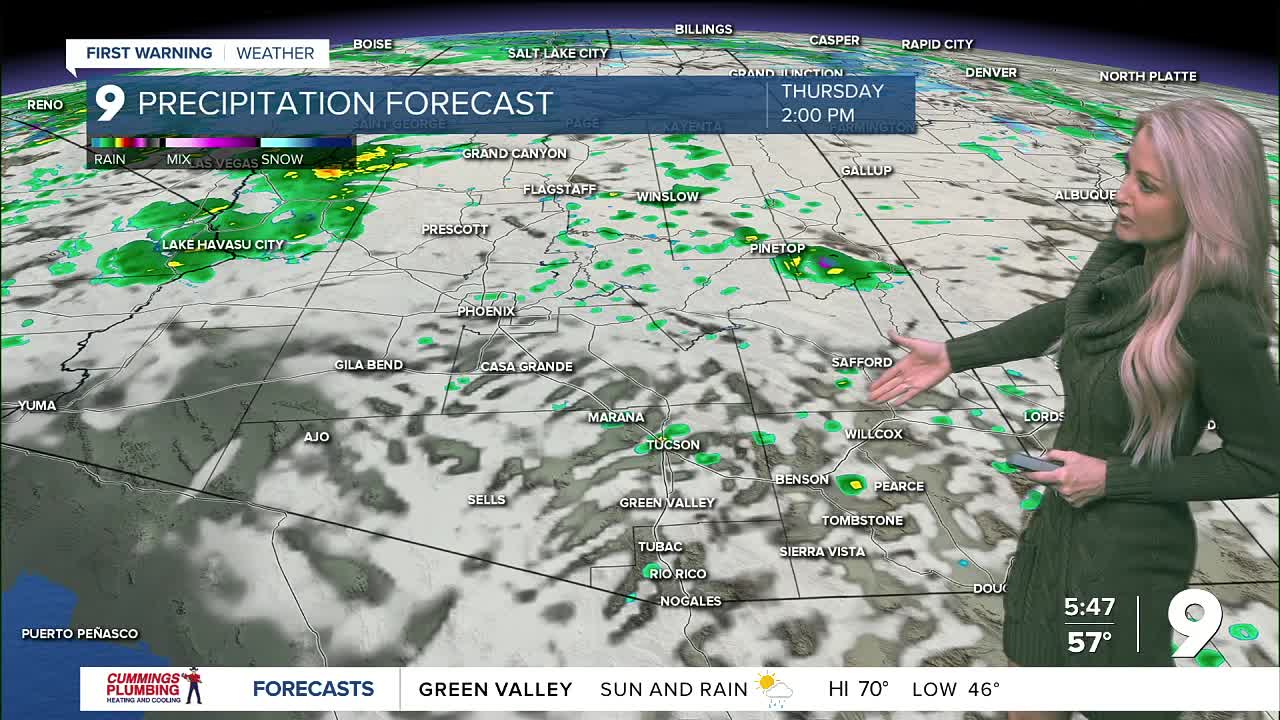 While the bulk of the heavier rain will stay north of Tucson, expect a similar pattern of light to moderate showers and a few thunderstorms in the valleys.