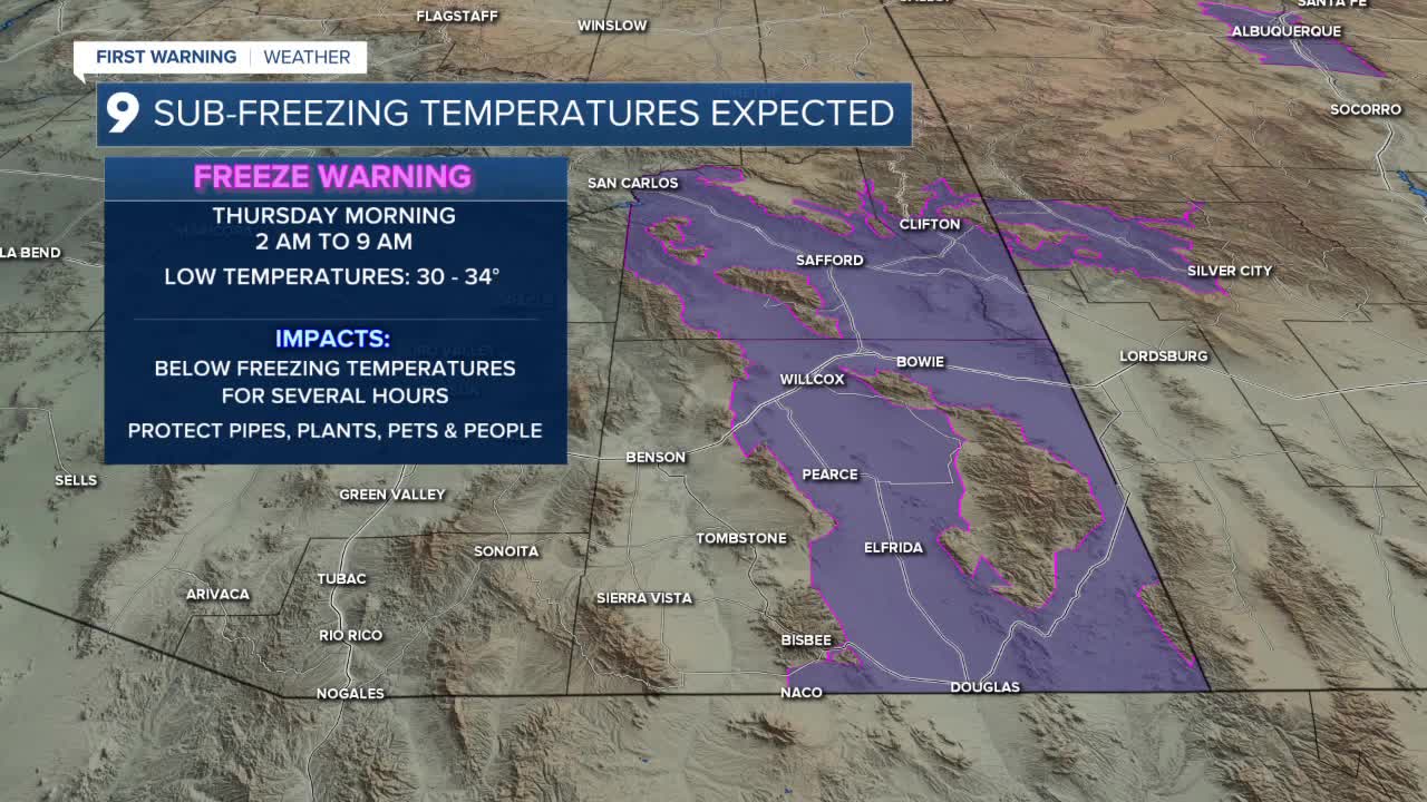 Portions of Greenlee, Graham and Cochise counties are included in the Freeze Warning where temperatures could drop as low as 30°.