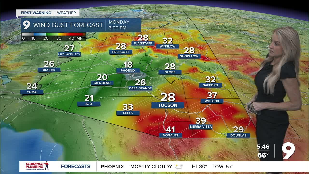TUCSON, Ariz. (KGUN) — Mostly cloudy to start the day, with southerly winds picking up again this afternoon. Expect winds 20-30 mph, gusting in the 40s.