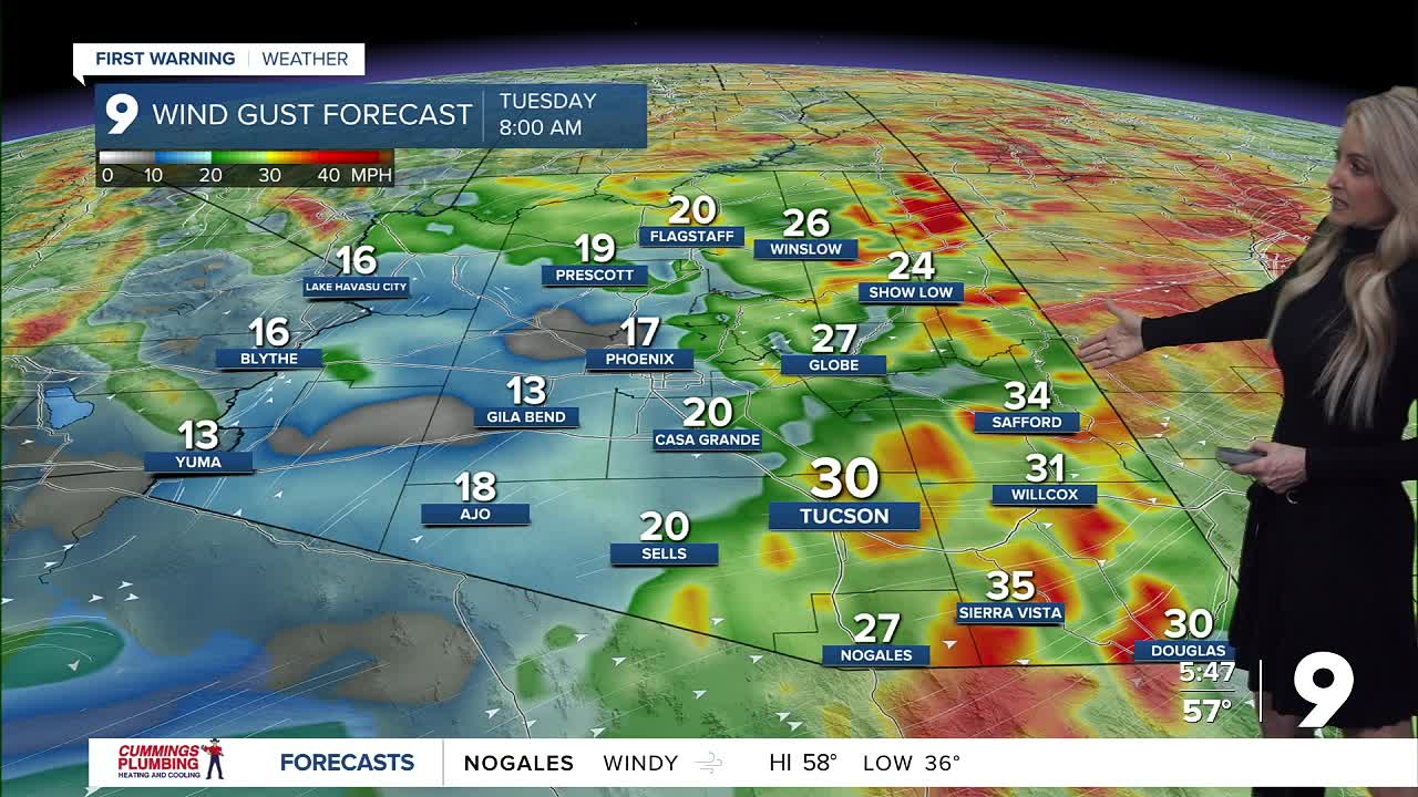 TUCSON, Ariz. (KGUN) — A cold front is pushing east into the region this morning, bringing strong southwest winds, and scattered showers.