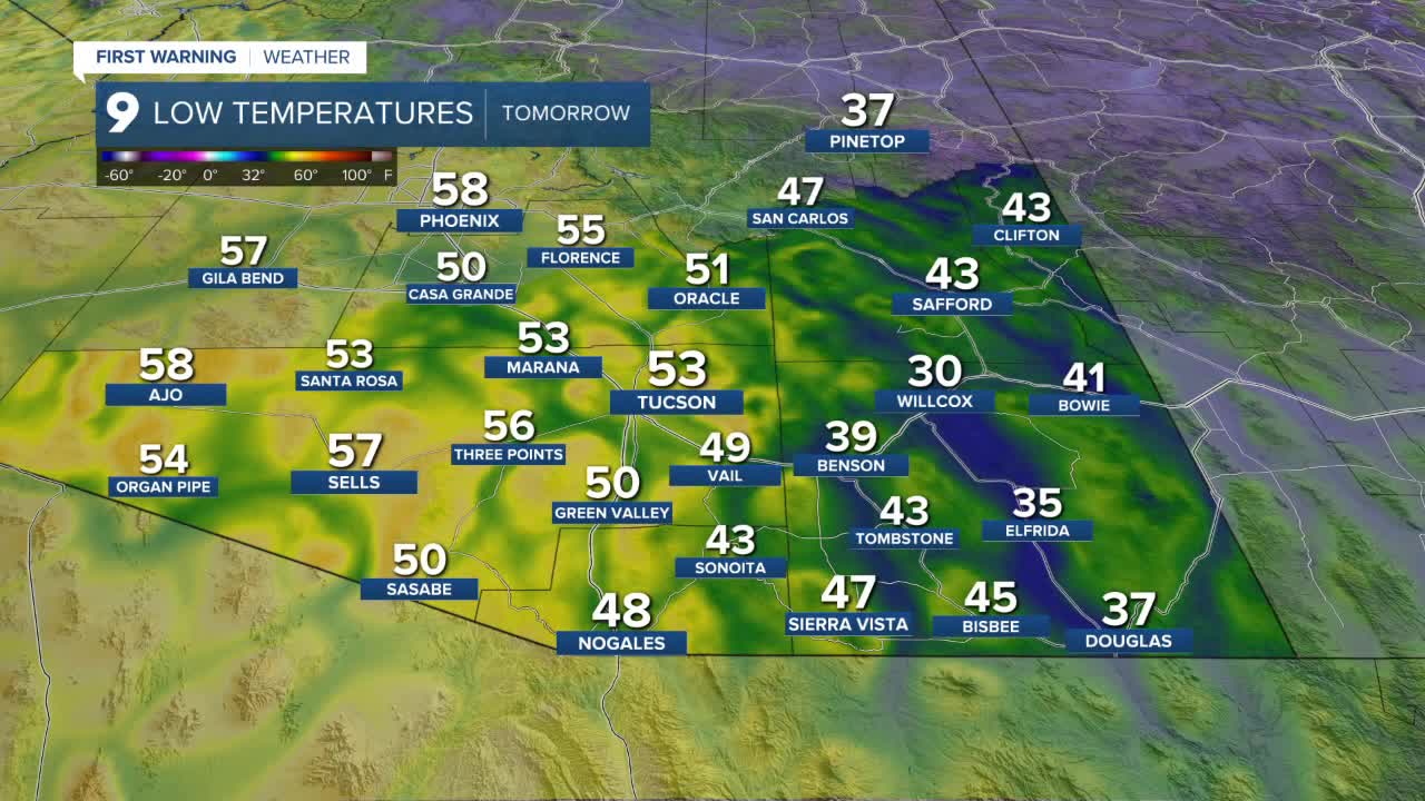 In Tucson, lows Tuesday morning will dip to around 53 degrees, with most of Pima County also in the 50s. Sierra Vista is forecast to reach 47 degrees, while colder spots in Cochise County, such as Willcox, could fall into the 30s.