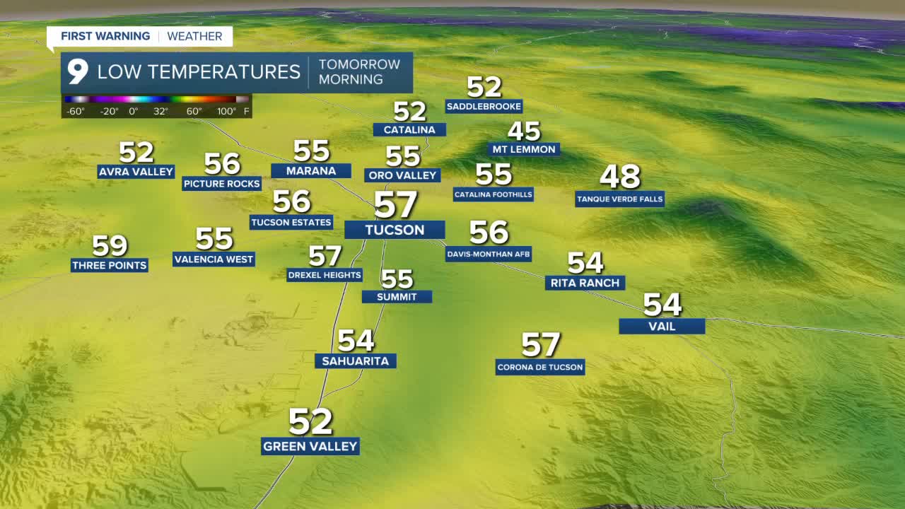Tuesday morning will start cooler compared to Monday. Tucson is expected to wake up around 56 degrees, with much of Pima County, including Ajo and Organ Pipe, in the upper 50s.