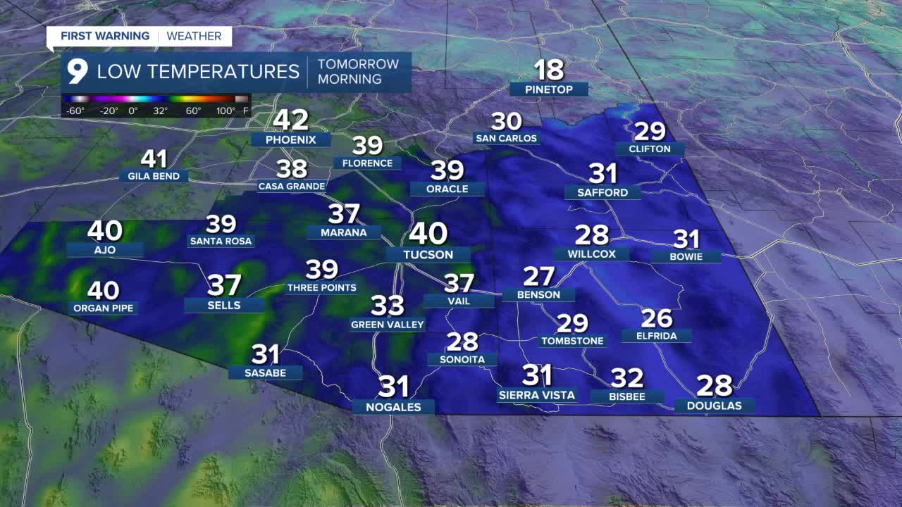Like Monday, Tucson is expected to see a cool overnight low of 40 degrees. Other parts of Pima County will drop into the upper 30s to low 40s by Tuesday morning.