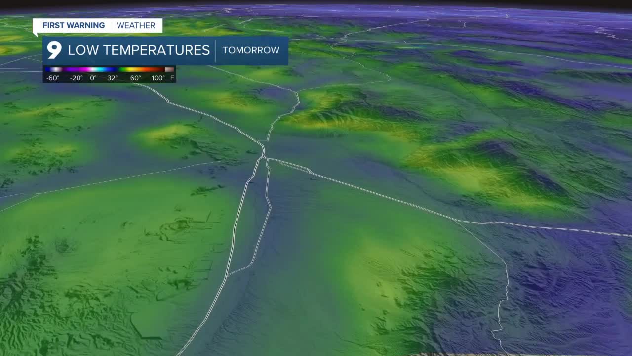 Overnight lows on Monday will fall into the 40s across Pima County, with Tucson expected to drop to around 43 degrees. Several areas in Cochise County may see freezing temperatures, including Wilcox at 30 degrees and Benson at 32 degrees. Sierra Vista is forecast to start the morning near 40 degrees.
