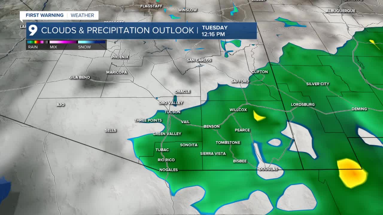 TUCSON, Ariz. (KGUN) — A weak weather system is moving down the Baja Peninsula today and is expected to cross into Sonora, Mexico Monday and Tuesday. This first storm isn’t very strong, but it could bring a slight chance of light showers to areas near the U.S.–Mexico border, particularly south and east of Tucson, mainly in Cochise County.