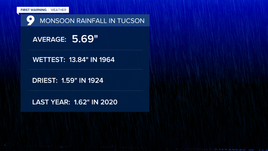 Most communities didn't even come close to measuring their average monsoon rain totals. In Tucson, at the airport, only 1.62 inches of rain fell. 2020 ranked as the second driest monsoon ever recorded -- just slightly behind 1924 when only 1.59 inches of rain fell.