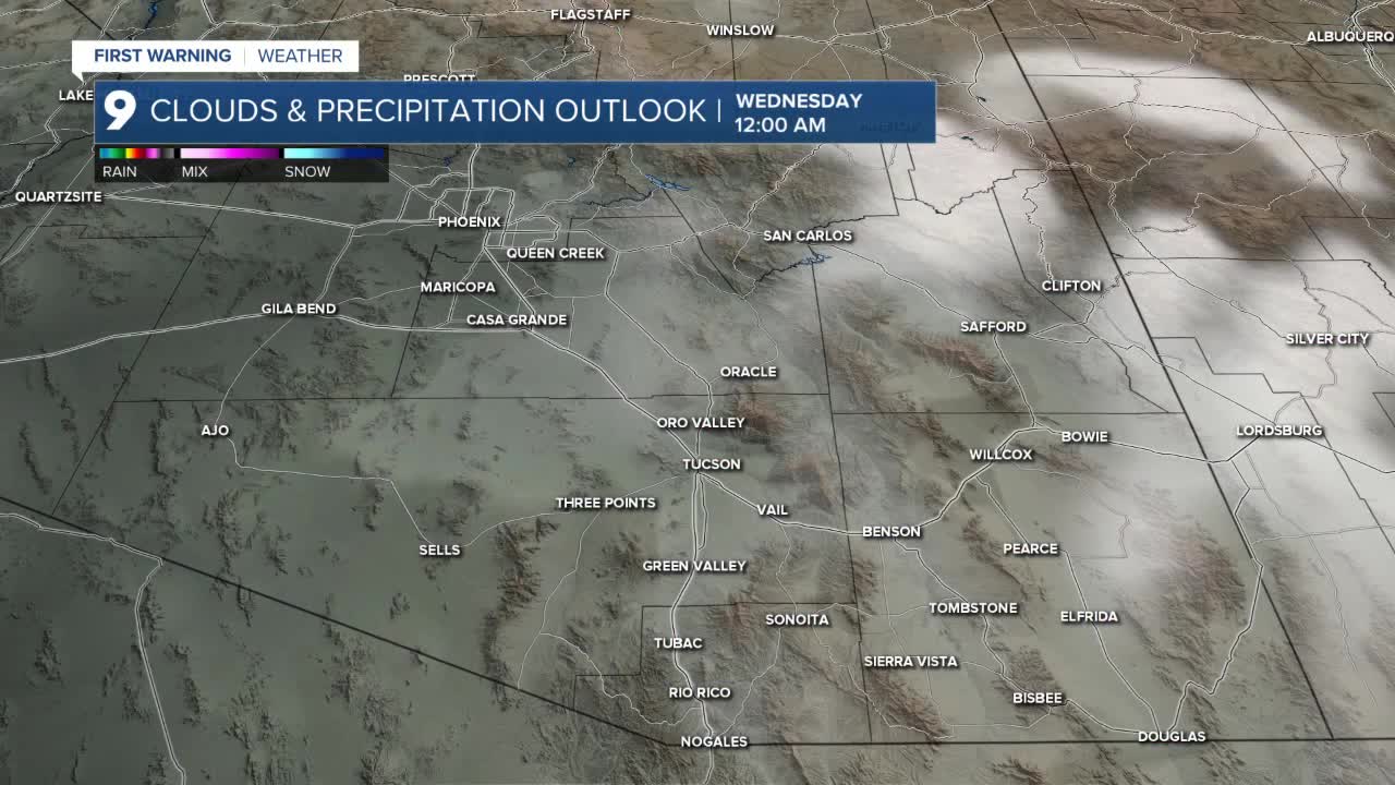With the incoming system, afternoon highs on Monday will reach the 70s for most communities, with a few areas topping out in the upper 60s. Tucson is forecast to reach 77 degrees, while Sierra Vista is expected to see a high of 69 degrees.