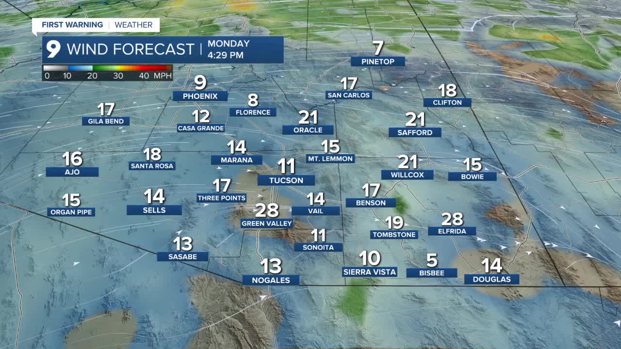 Afternoon temperatures will climb quickly. Tucson is expected to reach a high near 89 degrees, with central and western Pima County pushing into the low 90s. Sierra Vista will top out around 80 degrees.