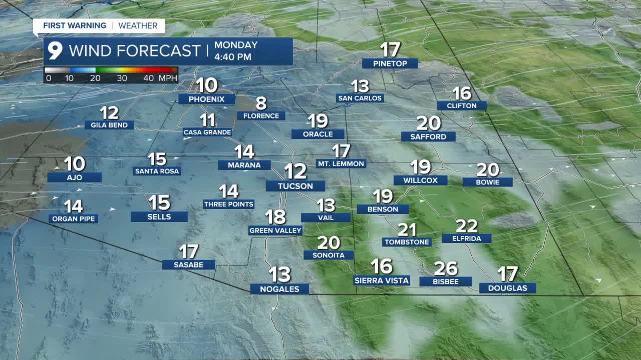 Afternoon temperatures will stay comfortable, largely in the 70s. Tucson is forecast to reach a high near 78 degrees, while Sierra Vista will top out around 74 degrees.