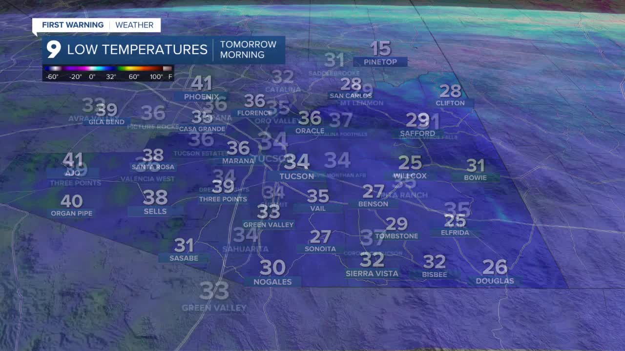 Monday morning will be cold across the region, with Tucson expected to drop to near-freezing temperatures. The city is forecast to see an overnight low of 34 degrees, while other parts of Pima County will wake up to lows ranging from the 30s to the low 40s.