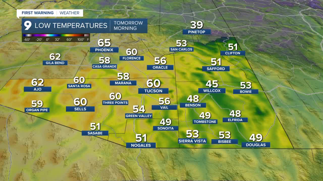 In Cochise County, Sierra Vista will wake up around 53 degrees, while areas like Willcox will be a bit cooler in the mid-40s.