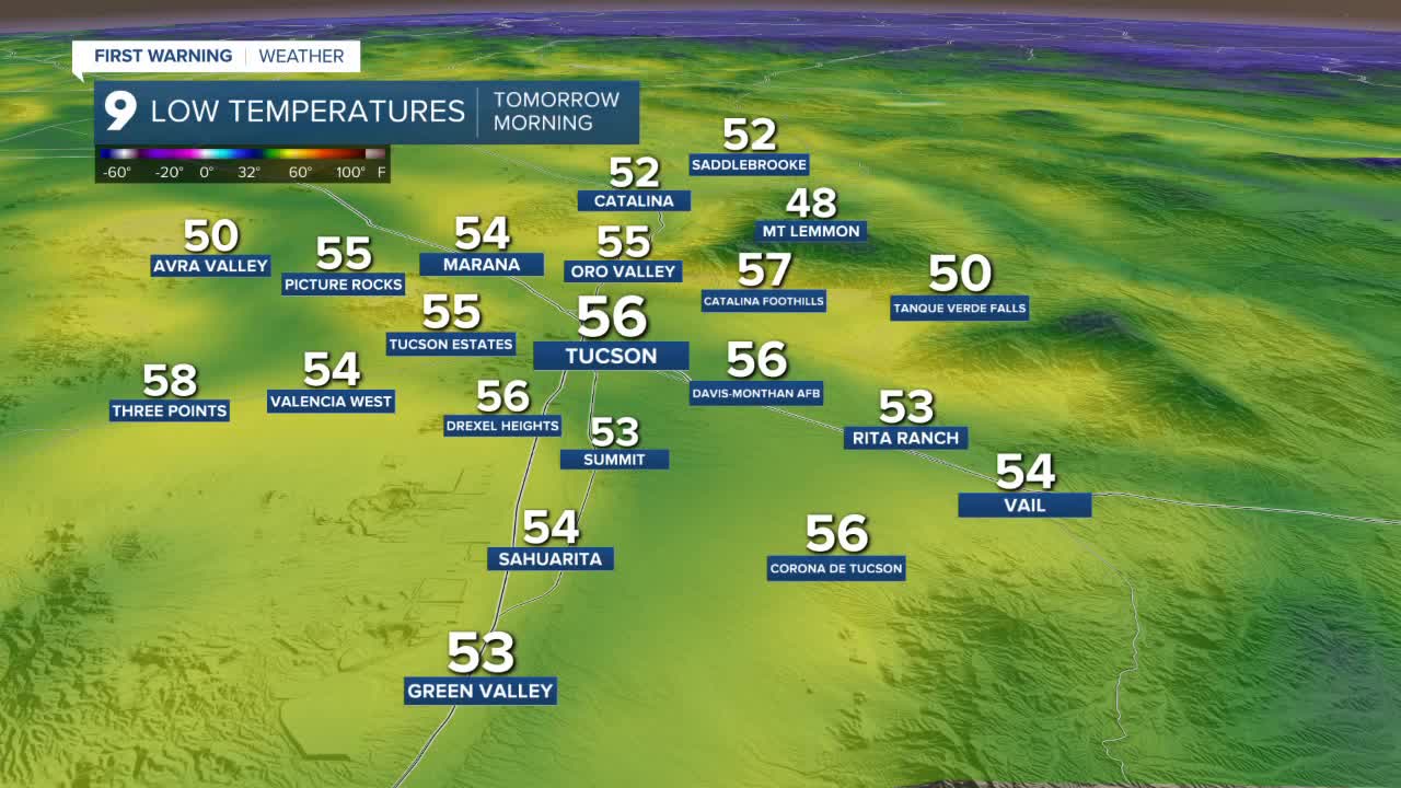 Tucson is forecast to drop to 56 degrees overnight. The rest of Pima County will see similar lows in the 50s. Sierra Vista is expected to reach an overnight low of 52 degrees. Other areas of Cochise County are forecast to see cooler temperatures in the mid to upper 40s.